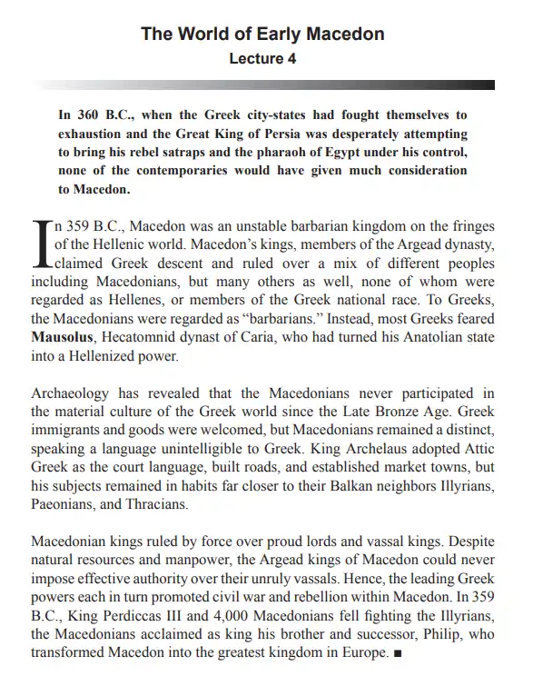 In 359 B.C., Macedon was an unstable barbarian kingdom on the fringes of the Hellenic world. Macedon’s kings, members of the Argead dynasty, claimed Greek descent and ruled over a mix of different peoples including Macedonians, but many others as well, none of whom were regarded as Hellenes, or members of the Greek national race. To Greeks, the Macedonians were regarded as “barbarians.